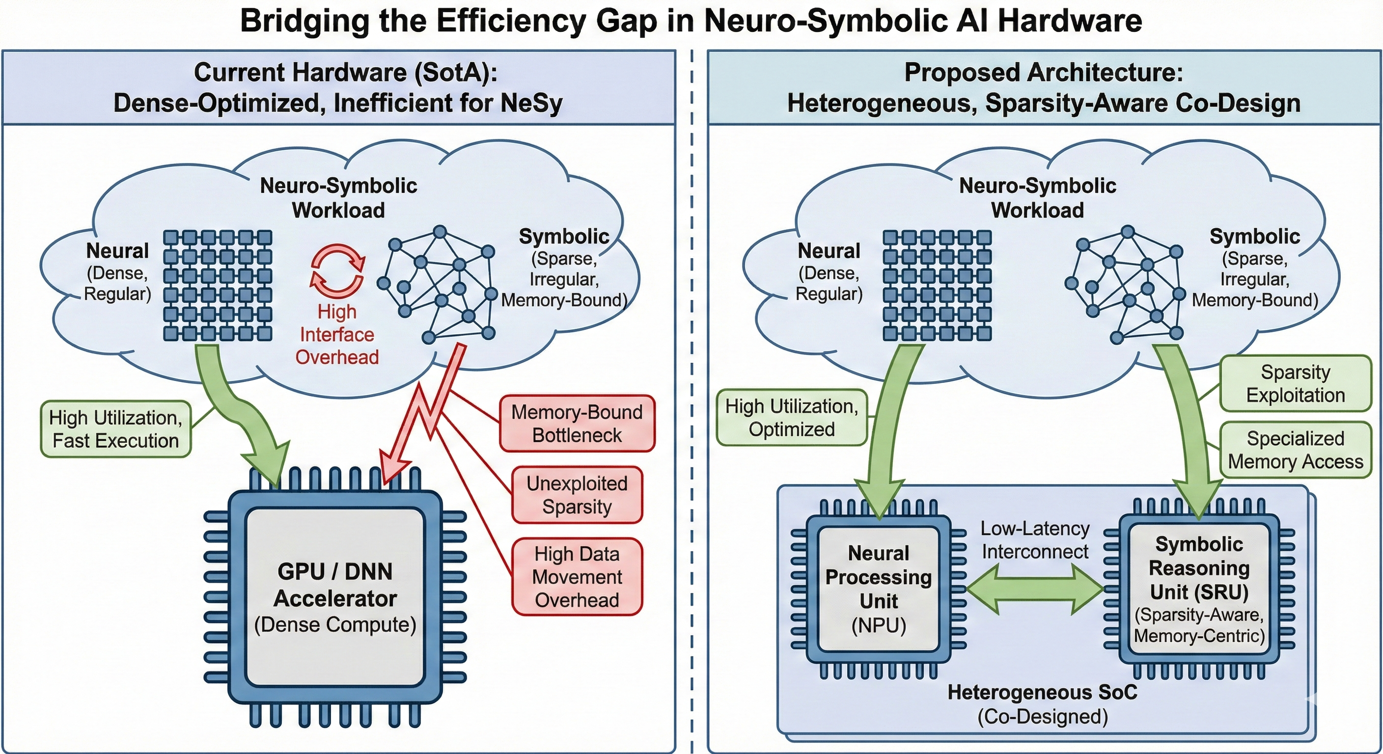 Gap in the SotA: Existing hardware, optimized for dense linear algebra, is severely inefficient for symbolic and probabilistic workloads. These reasoning components are typically memory-bound and characterized by complex, irregular memory access patterns, often resulting in extremely low hardware utilization and high data movement overheads. Crucially, current architectures fail to exploit the inherent, unstructured sparsity prevalent in symbolic and probabilistic reasoning, which is essential for reducing the energy and computational cost associated with these logic-driven tasks. Additionally, efficiently coupling neural and symbolic workloads on heterogeneous platforms remains a key challenge, as the distinct computational characteristics of these components require careful co-design to minimize interface overheads and maximize system-level performance.
